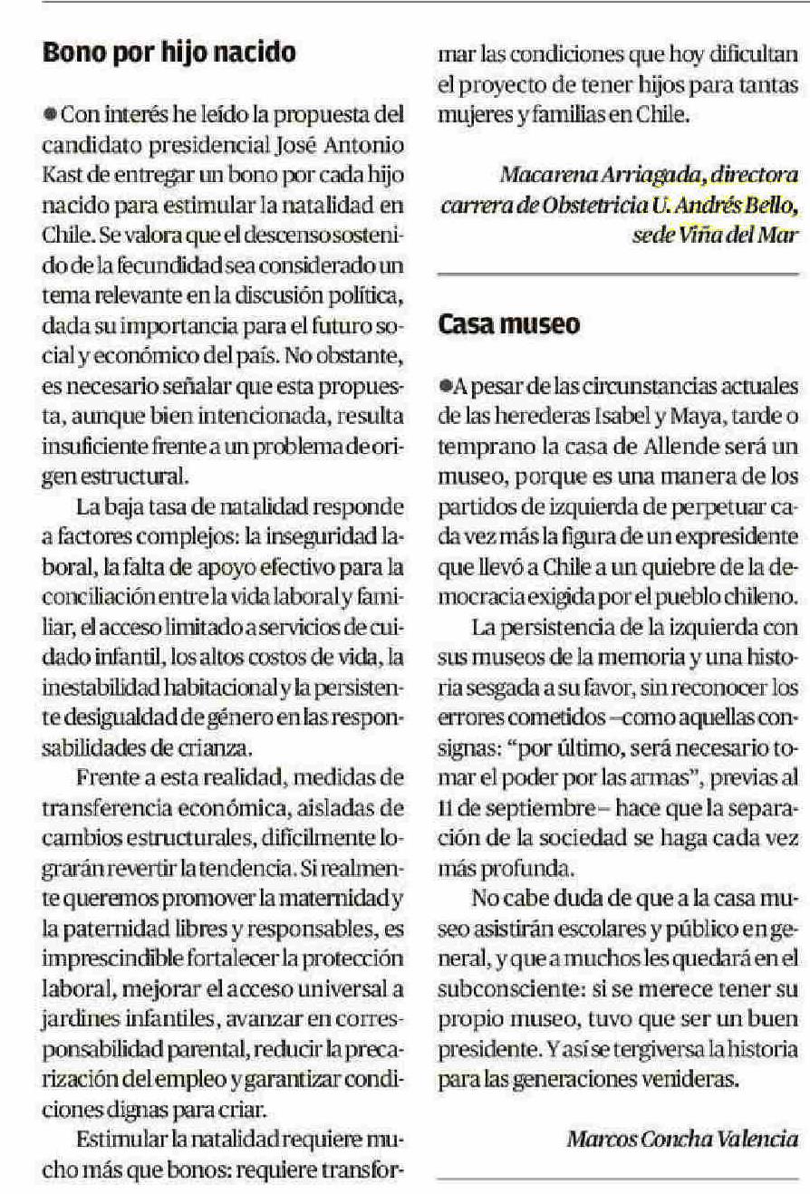 El una columna publicada por El Austral, Macarena Arriagada, directora de la carrera de Obstetricia de la U. Andrés Bello, sede Viña del Mar, comentó la propuesta por José Antonio Kast de entregar un bono por cada hijo nacido, para combatir la baja natalidad.