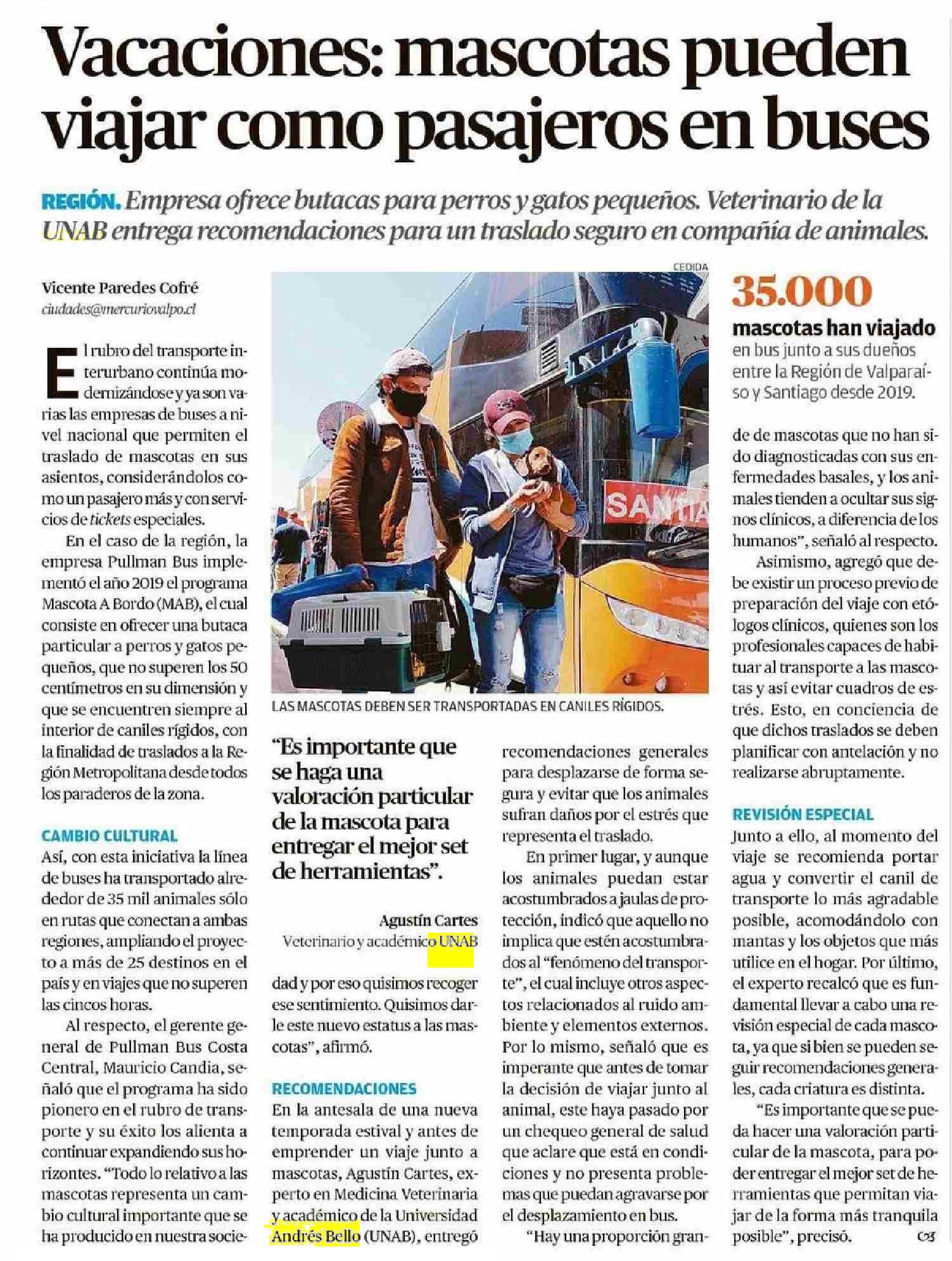 Agustín Cartes, veterinario y académico de la Universidad Andrés Bello sede Viña del Mar, entregó recomendaciones para un traslado seguro en compañía de mascotas. El Mercurio de Valparaíso, 7 de diciembre del 2023.