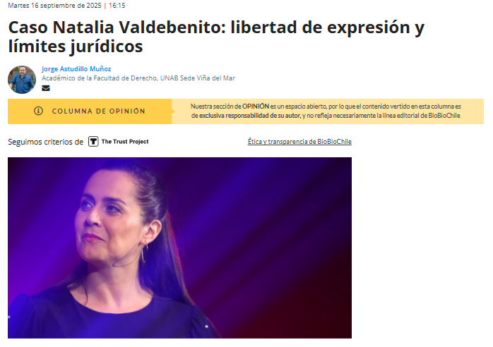 En una columna publicada por Radio Bío Bío, Jorge Astudillo, académico de la Facultad de Derecho de la U. Andrés Bello, sede Viña del Mar, reflexionó respecto a la libertad de expresión luego del recurso de protección presentado contra la comediante Natalia Valdebenito.