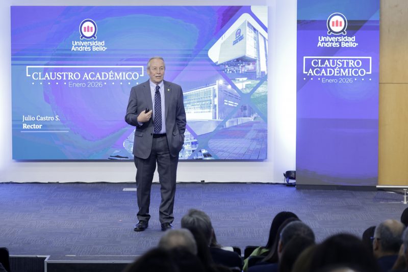 Durante el Claustro Académico, el rector de la Universidad Andrés Bello (UNAB), Julio Castro, expuso los principales hitos del quehacer institucional, abordando avances en áreas como investigación, calidad académica, infraestructura y actualización del modelo educativo, junto con el fortalecimiento de la proyección internacional de la universidad.