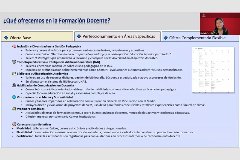 Por su parte, la directora de Desarrollo Docente y Tecnologías para el Aprendizaje, Mabel Cortés, abordó el sentido estratégico del plan de formación docente, destacando su impacto directo en la experiencia formativa de los estudiantes y su alineación con los desafíos actuales de la educación superior.