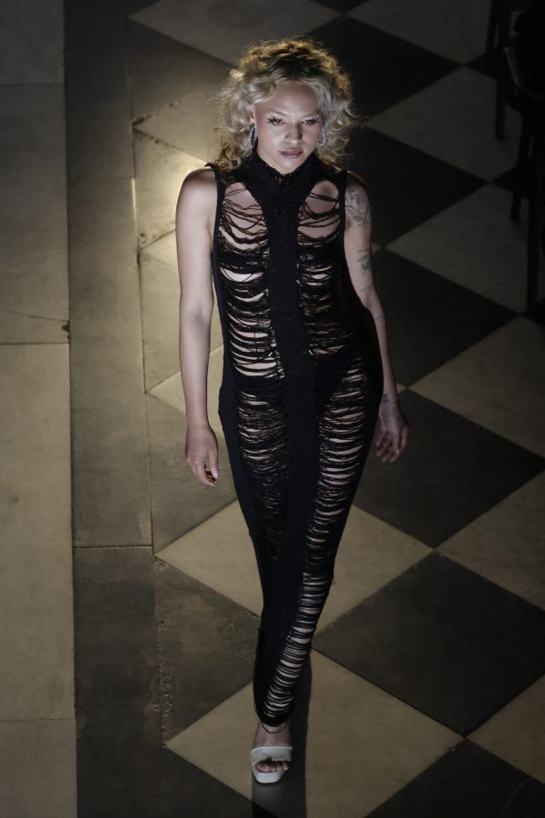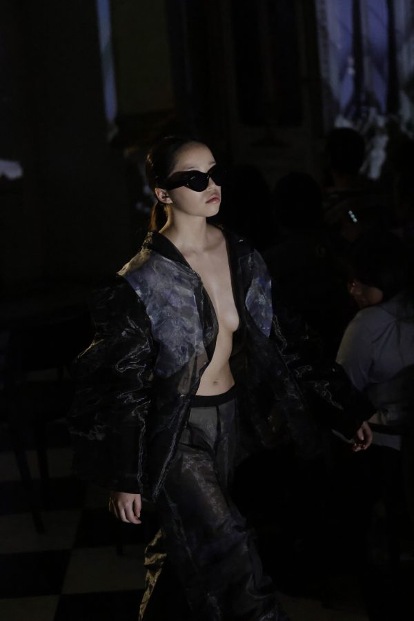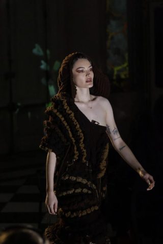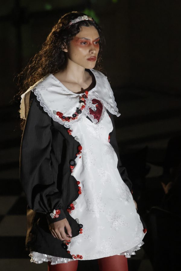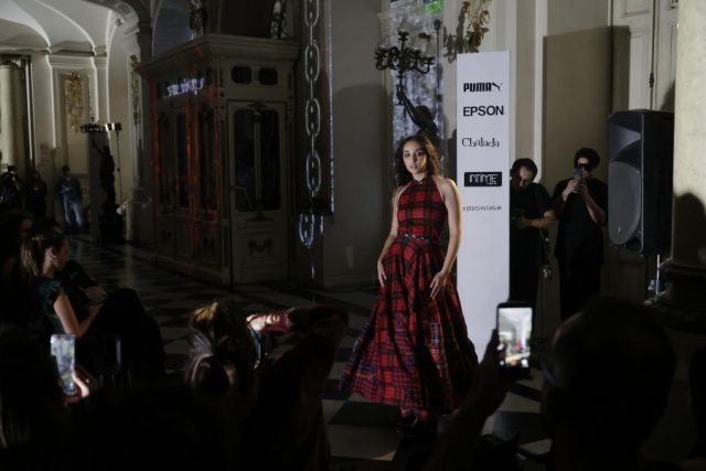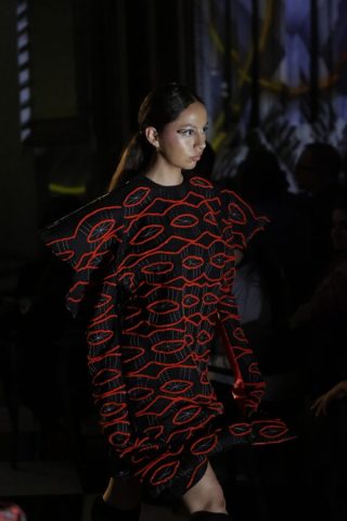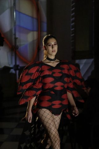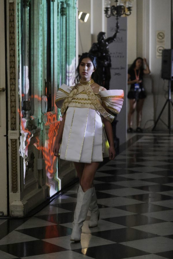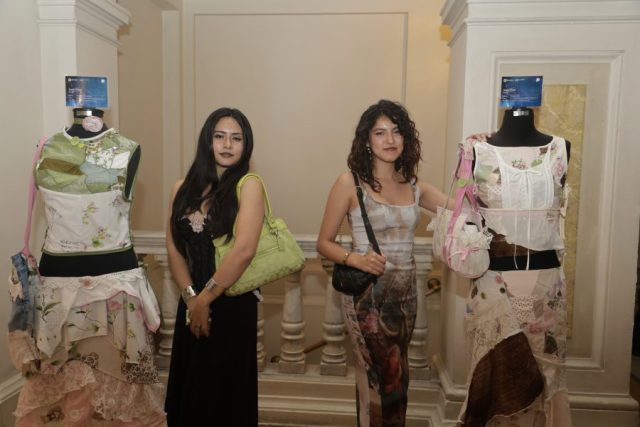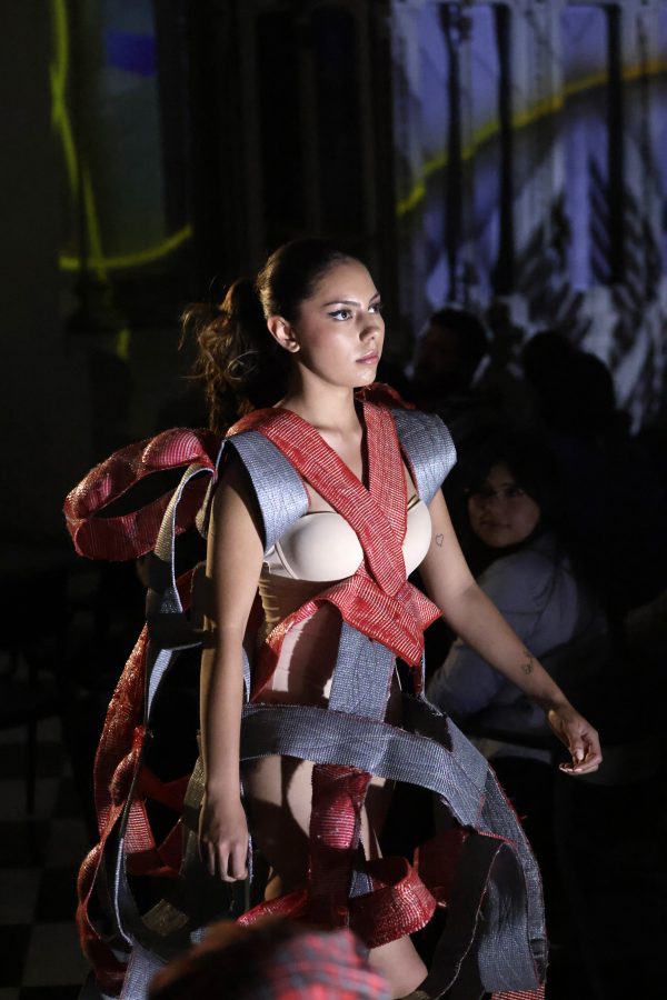 Una de las líneas destacadas en “Vestir el Ser” fue la experimentación con materiales y la sostenibilidad. La estudiante Terry Cruz, de segundo año, presentó cuatro diseños basados en técnicas y materiales reciclados. “Mi diseño es completamente hecho con materiales o de una forma sostenible. Porque son bolsas recicladas ” explicó.
